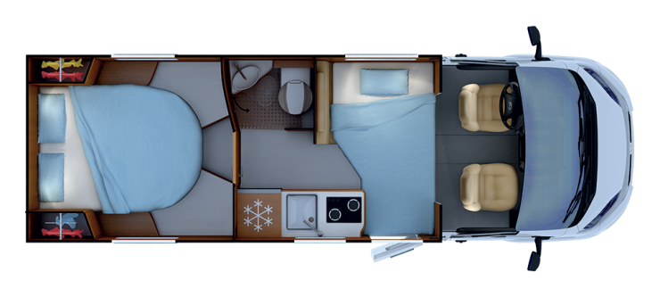 Planlösningen följer gängse standard med badrum och kök i mitten, köket på passagerarsidan. Det som skiljer ut den är att den elektriskt (tillval) höj och sänkbara dubbelsängen centrerats och kan fällas upp vid fotändan för att ge åtkomst till skåpen.