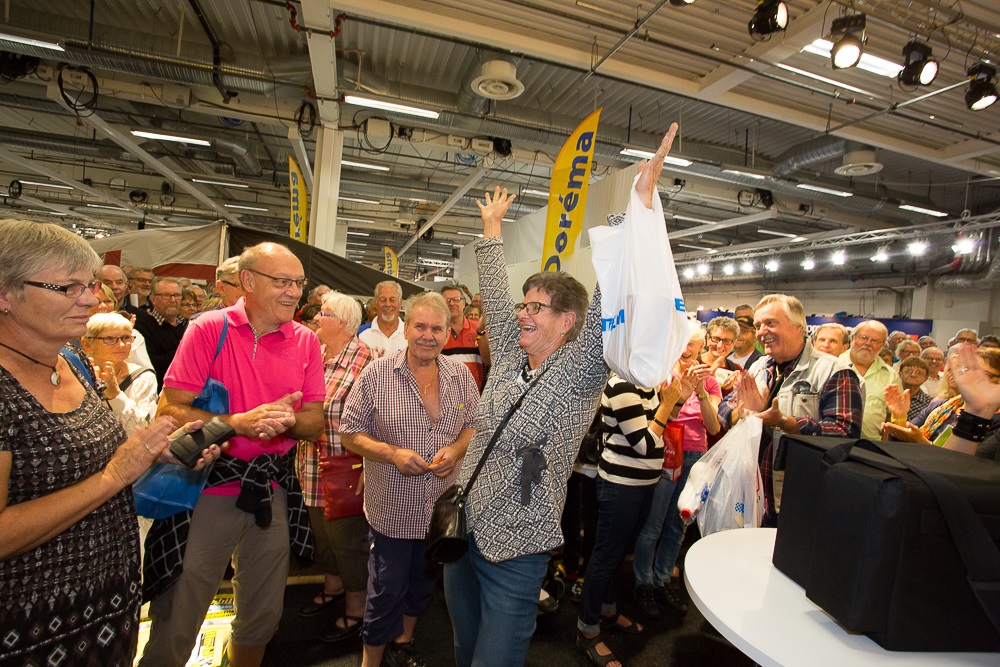 Vid dragningen hade åtskilliga personer sökt sig till vår monter och monterytan räckte långt ifrån till för den månghövdade och förväntansfulla skaran. Stämningen var på topp när vår medarbetare Claus Widell tog tag i mikrofonen strax före klockan tre och alla andaktsfullt inväntade det magiska klockslaget.