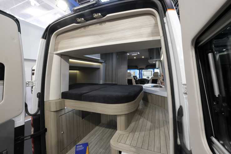 På mässan Caravan Salon hittade vi denna spännande lösning från tillverkaren Innova från Holland. En säng är som bekant relativt lång och en queenbed är som de flesta vet en bred säng. Hur får man plats med en sån på tvären i en smal plåtis? Man bygger en slide out som glider ut på sidan så klart.