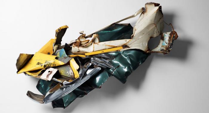 Det är konstverket "Honest 508" av skulptören John Chamberlain som ska auktioneras ut 12 november. Det är ett av konstnärens verk som består av deformerade bildelar som ses som "uttolkare av tidsandan i skärningspunkten mellan abstrakt expressionism och pop".