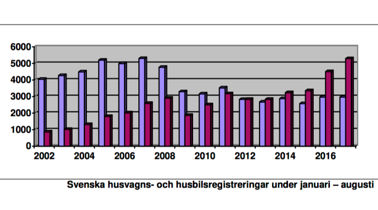 Augusti månads husbilsregistreringar visar 629 stycken, medan det i augusti föregående år registrerades 447 husbilar. Hittills under kalenderåret 2017 har det totalt registrerats 5 292 husbilar, medan det under motsvarande period 2016 registrerades 4 509 stycken. I procent innebär detta en ökning med 17,37 % för år 2017.