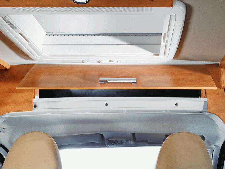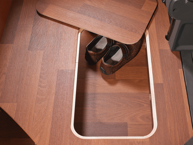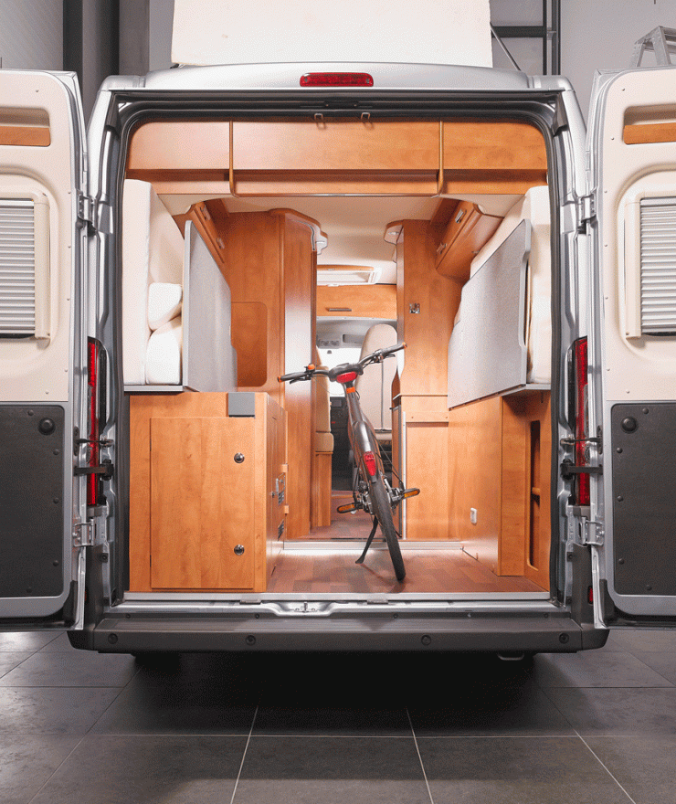 En cykel får plats mellan de uppfällda långbäddarna i 640