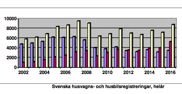 Intressant skillnad att notera: Medan antalet husbilar år 2008 utgjorde cirka 38 procent av det totala antalet nyregistrerade fritidsfordon, så har andelen under 2016 uppgått till hela 60 procent av nyregistreringarna. 2016 var också det femte året i rad som antalet nyregistrerade husbilar översteg antalet nyregistrerade husvagnar.