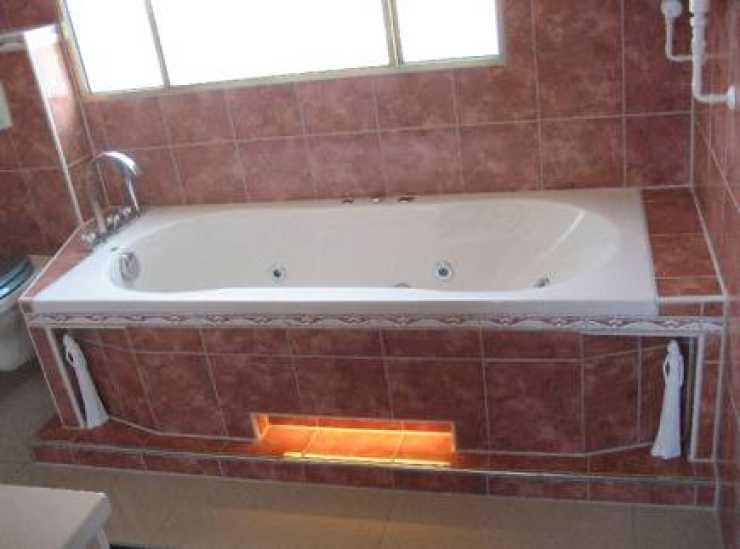Helkaklat badrum med bubbelkar, statyetter och en riktig porslinstoalett. Notera raden med lysknappar utanför.
