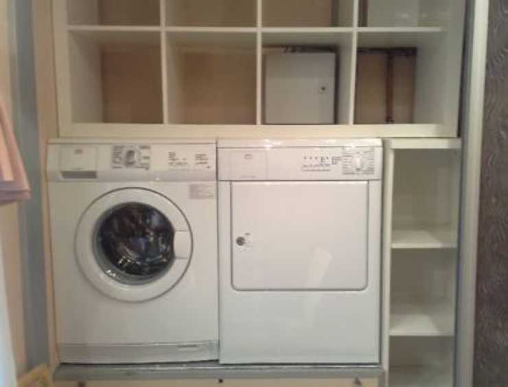 Tvättstuga med hyllor för kläder samt torktumlare och tvättmaskin.