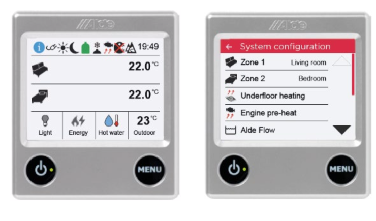 Alde ́s värmesystem styrs via Alde Manöverpanelenn Panelen som harfått ett nytt gränssnitt där du enkelt kan navigera mellan de olika zonerna och naturligtvis också styra värmesystemets alla övriga funktioner.