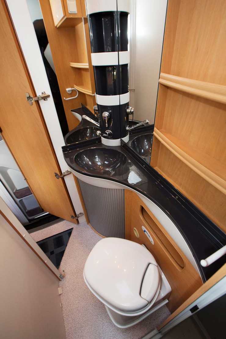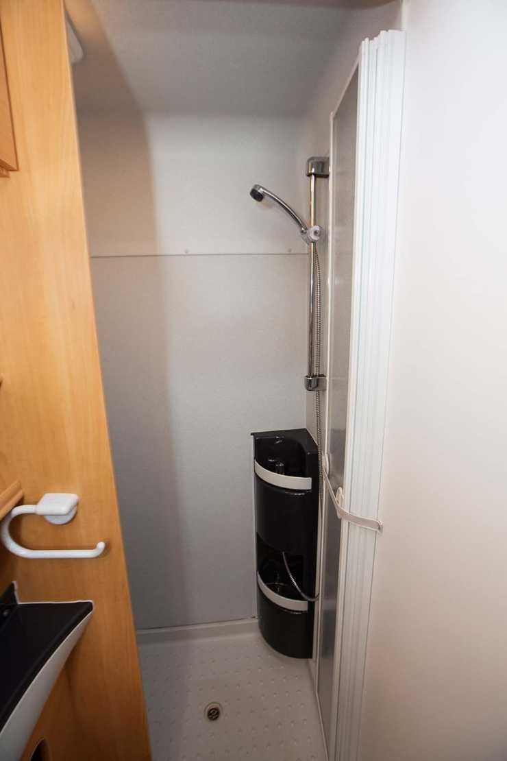 Rakt fram innanför entrén ligger hygienutrymmet i det vänstra bakre hörnet av bilen. Tvättrummet har en separat dusch och utrymmet är tillräckligt stort för ett bekvämt användande och är praktiskt inrett.