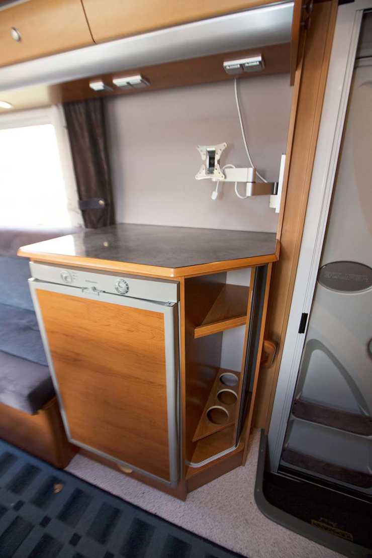 Strax framför hygienutrymmet ligger bilens vinkelkök med en trelågig gasolspis och gott om lådor och skåp. Ett av skåpen är ett så kallat apotekarskåp med belysning. Kylskåpet rymmer 108-liter och är placerat på andra sidan mittgången. Ovanpå det finns en bra bänk som fungerar som arbets- eller avställningsyta.