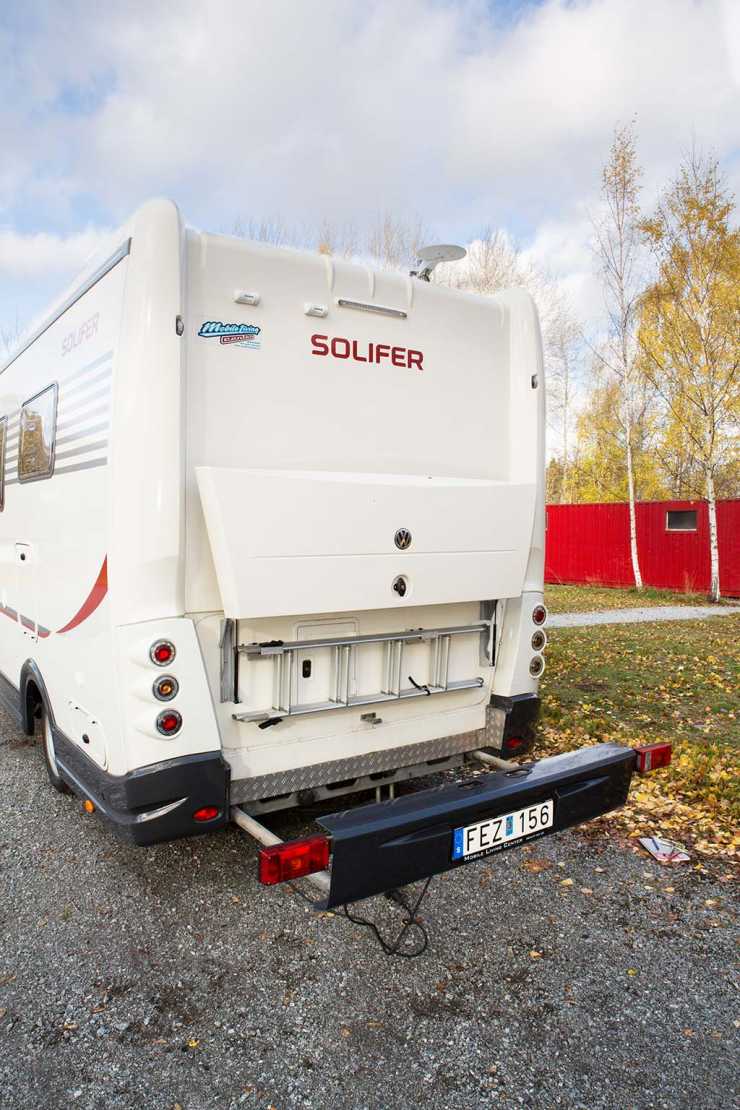 Det är en välskött bil vi äntrar genom ingångsdörren längst bak. Insteget är högt men underlättas av det elmanövrerade fotsteget. På bakstammen har man ett originaltillbehör i form av en cykelplattform. Det sistnämnda skall jag komma tillbaka till om en stund men vi börjar med en rundvandring.