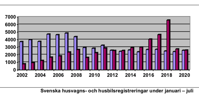 Trafikanalys (SCB) rapporterar att det nyregistrerades 23 804 personbilar under juli 2020 vilket är en minskning med 4,6 procent jämfört med juli föregående år. De rapporterar vidare att det nyregistrerats 2 992 husbilar under 2020 mot 3 156 föregående år, en minskning med 5,2 procent, för husvagnar anger de 2 869 gentemot 2 731, en ökning med 5,1 procent.