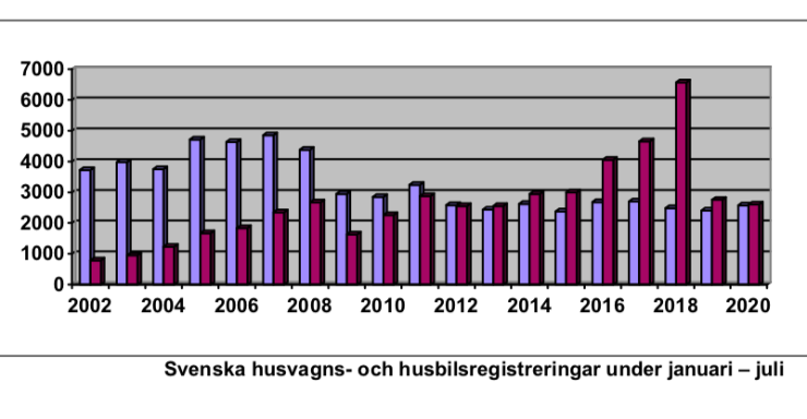 Enligt statistikföretaget Vroom såldes det i juli 540 husbilar vilket är en ökning med 37 procent mot juli 2019 samt sett på årsbasis 2 405 vilket är en minskning med 1 procent. Privatmarknaden för personbilar var betydligt svagare då det i juli levererades 10 803 nya bilar vilket är en minskning med 14 procent jämfört med juli 2019.