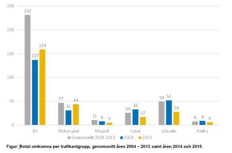 Trafikanalys officiella statistik om vägtrafikskador 2015 visar att 259 personer omkom i vägtrafiken, 2 445 personer skadades svårt och 17 198 skadades lindrigt. Utöver det omkom 23 personer på grund av självmord samt 25 personer som varit med i en trafikolycka men där dödsorsaken varit sjukdom.