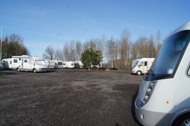 Själva platsen är plan och grusad. Området är inhägnat men det finns ingen grind som låses, ställplatsen är öppen dygnet runt.