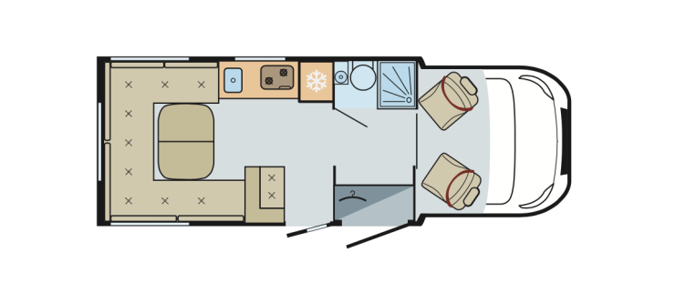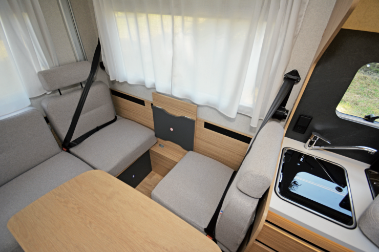 Nya Pilote 720 U har u-soffa längst bak med två bältade platser. Nedsänkbar taksäng ovanför.