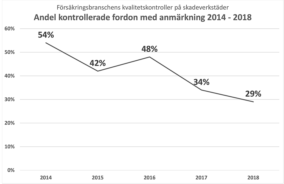 Visserligen ger resultatet vid handen att det under de fem åren skett en trendmässig förbättring men fortfarande når ungefär en tredjedel, 29 procent, inte upp till kraven och ofta handlar det om rent slarv från verkstadens sida. 1 300 kontroller har utförts under 2018 och i jämförelse med föregående års underkännanden som var på 34 procent är det dock en förbättring. När kontrollerna startade 2014 var siffran hela 54 procent.