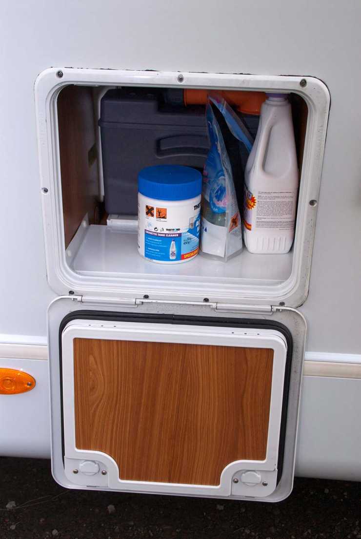 Utvändigt är väggarna släta och vita. Bagaget är däremot ganska litet och luckan mäter 92x67 cm. Lastutrymmet är dock genomgående med lika stor lucka på bägge sidor men på vänstersidan begränsas det av gasolutrymmet med plats för två flaskor. Många ägare utrustar sina bilar med en extra golvskiva, så även jag. Fördelen är att bagageutrymmet då delas i två, där det undre är perfekt till förvaring av bord och stolar. Lastvikten är 543 kilo och mitt exemplar har jag utrustat med dragkrok och med BE-behörighet får jag dra 1 900 kg på kroken.
