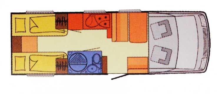 Snett in mot vänster finns vinkelköket med gott om lådor och skåp. Tre lågor på spisen gör att du kan laga en större middag och den kombinerade kyl- och frysen från Dometic med AES-teknik, gör att du kan förvara mat för en längre resa. Ett av skåpen är ett utdragbart apotekarskåp som sväljer det mesta av torrvaror och ovanför finns två bra skåp för porslin. Lådorna under köksbänken är stora, djupa och breda. Längre bak finns garderober på vardera sida om mittgången och mellan långbäddarna kan det bäddas igen för att få en riktig stor dubbelsäng. På den ena sidan mäter sängen 75x205 cm medan den på andra sidan är ytterligare 15 cm längre. Ovanför hela bädden finns skåpraden som går som ett U i hela bakre delen av bilen. Med andra ord – praktiskt och gott om plats.