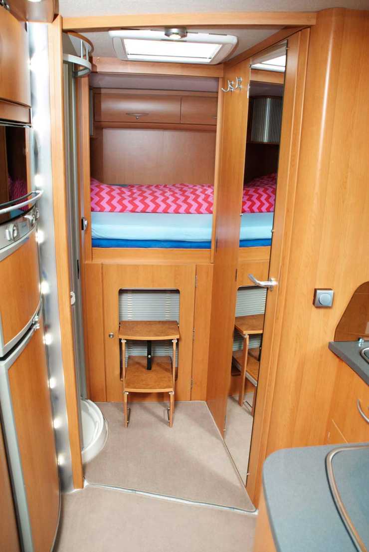 Den bakre sängen ligger på tvärs i bilen och är kanske inte så praktisk när man sover två. Den ena får klättra över den andra men utrymmet räcker gott. Fönster på bägge sidor och en taklucka med mörkläggning och myggnät.
