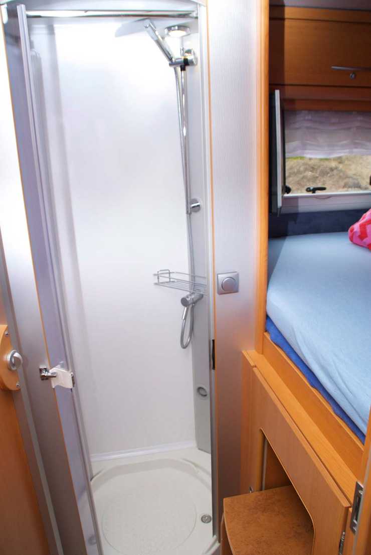 Frankia har alltid brytt sig lite extra om lösningar i badrummet. Här har dusch och toalett separerats men kan med hjälp av en fiffig lösning med dörren, göras om till ett enda stort utrymme. Det är ljust och trevligt och med gott om skåp och belysning. 150 liter färskvatten ger möjlighet till många duschar.