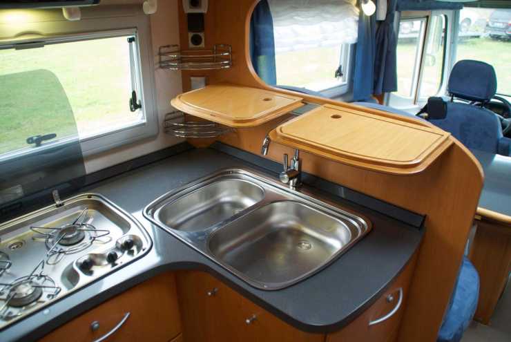 Den elektriska instegstrappan ger tillträde till bodelen och direkt innanför möts man av köket i vinkel som har flera bra detaljer. Locken till diskhon kan till exempel användas både som skärbräda och som avlastningsyta när de placeras på sina hållare ovanför kranen. Tre lågor på spisen och en Dometic kyl/frys på 190 respektive 35 liter. Ovanför har det placerats en gasolugn.