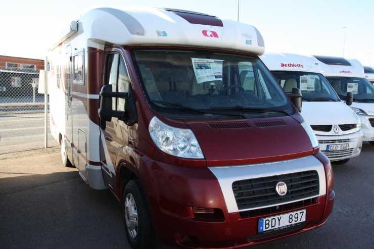 Alexander: ”Populär modell från premiummärket Carthago. Precis över 8 meter med Fiats stora 3.0 liters motor på 177 hk. Den har generös sittgrupp, stort kök, långbäddar, separat dusch och sovplatser för 4 personer. Just denna modell är välutrustad med bland annat hydrauliska stödben från E&P, Alde vattenburen värme, solcell och dubbla AC.”
