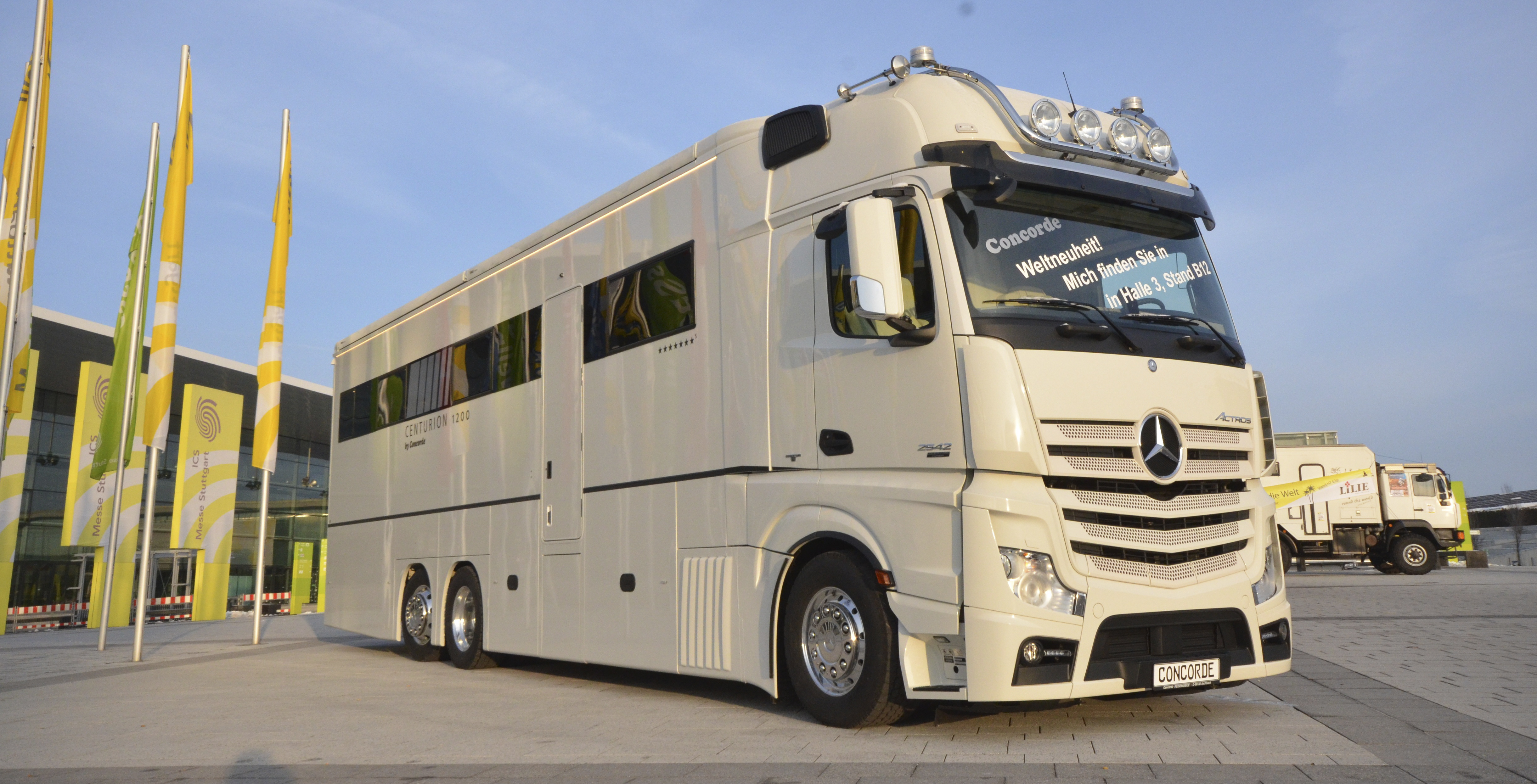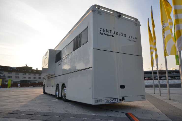 Den senaste nyheten från Concorde är en riktig bjässe som kommer väga över 20 ton. Husbilen heter Concorde Centurion och byggs på ett treaxlat chassi från lastbilen Mercedes Benz Actros. På CMT-mässan i Stuttgart visas just nu en modell som har garage baktill där en Mini Cooper får plats. Concorde behåller Actros hytt och den första modellen som presenterats bygger på Actros största hytt med ståhöjden 2,13 centimeter mellan sätena. Vidare klarar nya Actros avgasnormerna för 2014. Någon prisinformation för Sverige finns inte ännu.