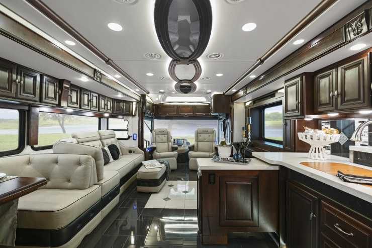 Under skalet ruvar en sexcylindrig Cummins på 450 hk. Hästkrafterna behövs nog eftersom vi här pratar om en totalvikt på 27 ton. Men så innehåller bilen rikligt med utrustning som exempelvis tvättmaskin, torktumlare, diskmaskin, fyra slide outs, massagestolar, två toaletter, tre-fyra tv-apparater, ”öppen spis” och massiva material i bänkar, möbler och golv.