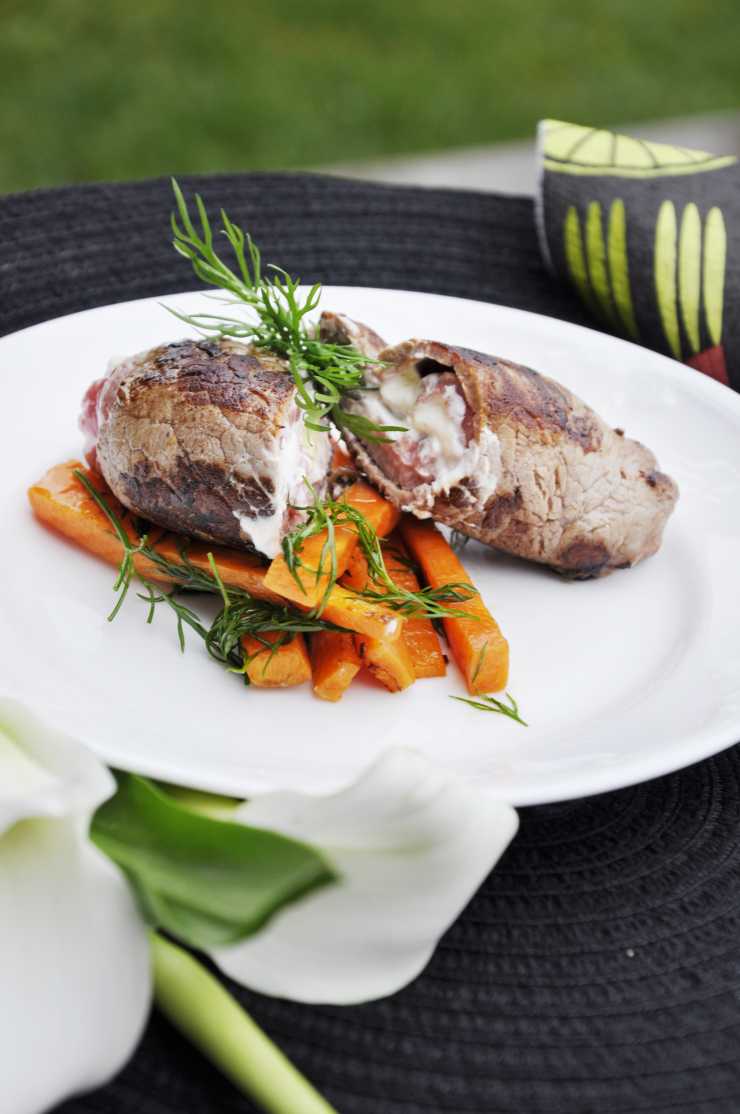 Fyllda lövbiffar med smörstekta morötter.