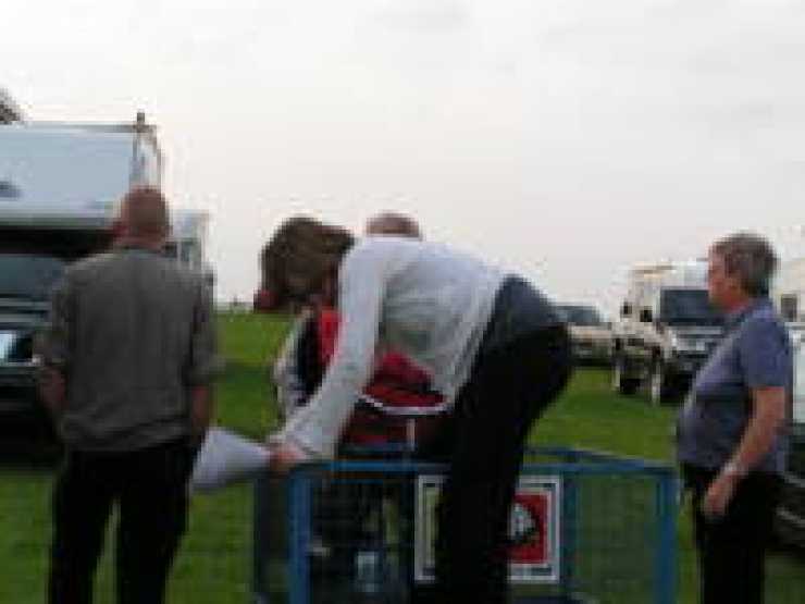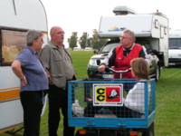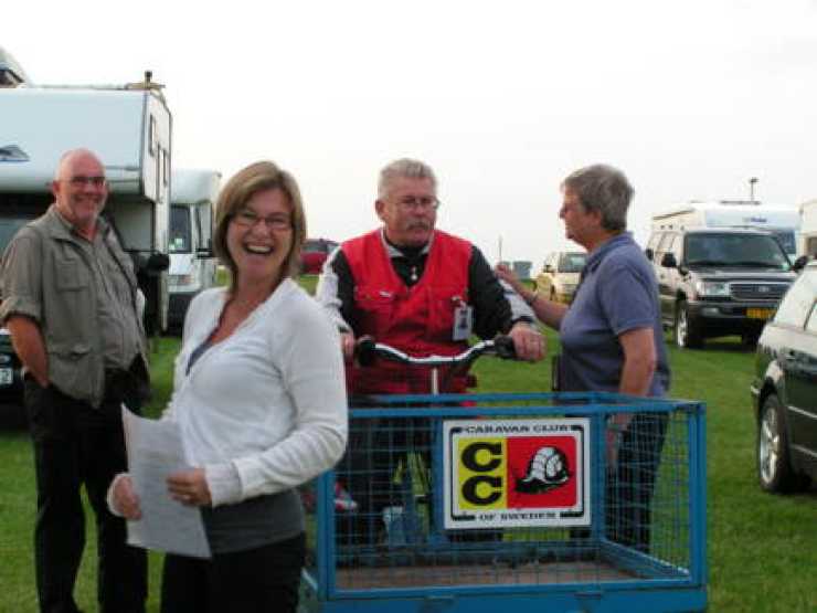 Mässfunktionären Jan-Erik hade koll på läget bakom B- och D-hallen. Chefredaktör Carola Eklundh visar att hon är smidig som ett kylskåp... Så glad var Carola för mopperesan - första åkturen nånsin på en flakmoppe!Bättre än att åka Ferrari. Och tyst gick han, elmoppen.