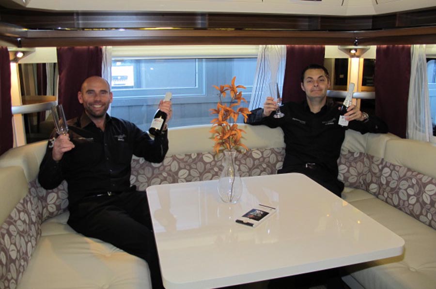 Säljarna Marcus och Andreas firar sitt nya märke.