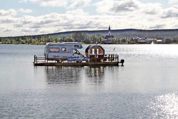 På Kraja Camping i Arjeplog kan husvagnen och husbilen tas med ut på en flotte på sjön Hornavan. Flotten har badtunna, grill och utemöbler, och dessutom en motor för att det ska vara enkelt att ta sig runt.