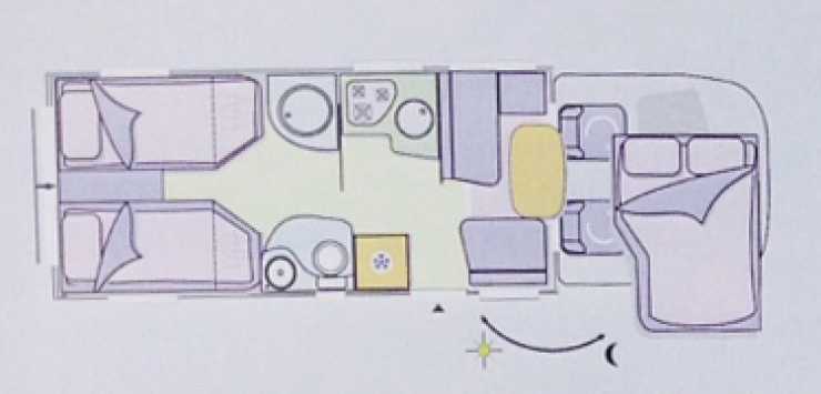 Modellen har separat toalett och dusch, ett 175 liters kylskåp, en L-formad sittgrupp med ytterligare en soffa på tvären och ett belyst förvaringsutrymme i bak som du kommer åt från två håll.