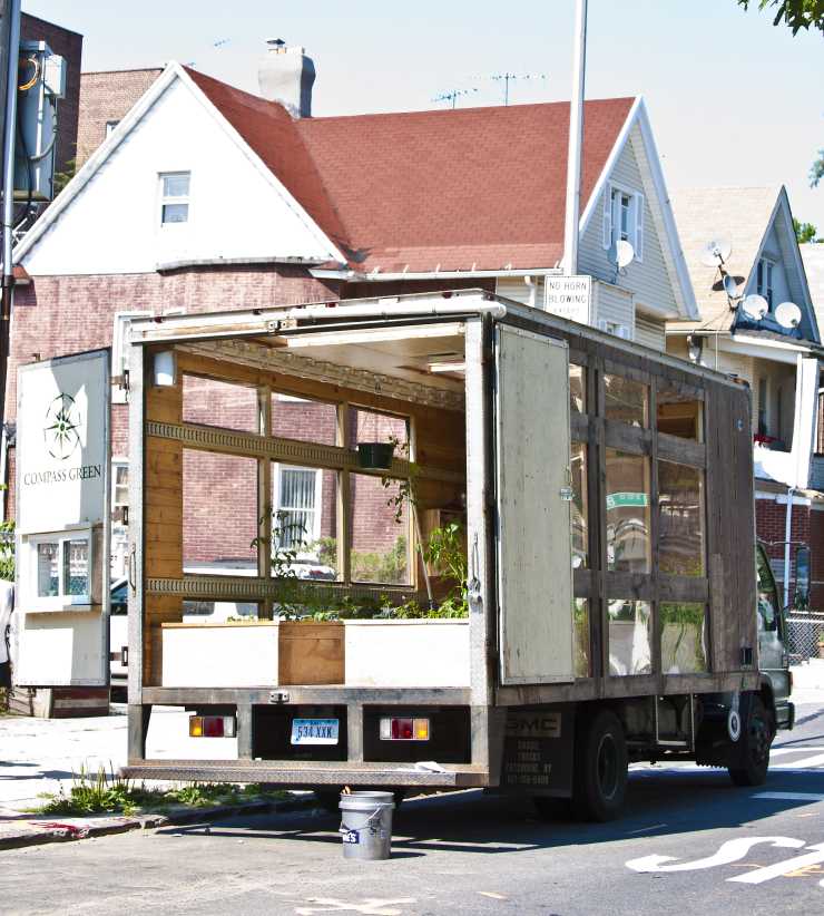 Compass Green är namnet på den lilla gröna lastbilen som byggts om till växthus och drivs på filtrerad, återvunnen matolja. Skaparna bakom fordonet som får folk att höja på ögonbrynen och tappa hakan längs sin färd genom USA heter Nick Runkle och Justin Cutter, och kommer från Brooklyn i New York.