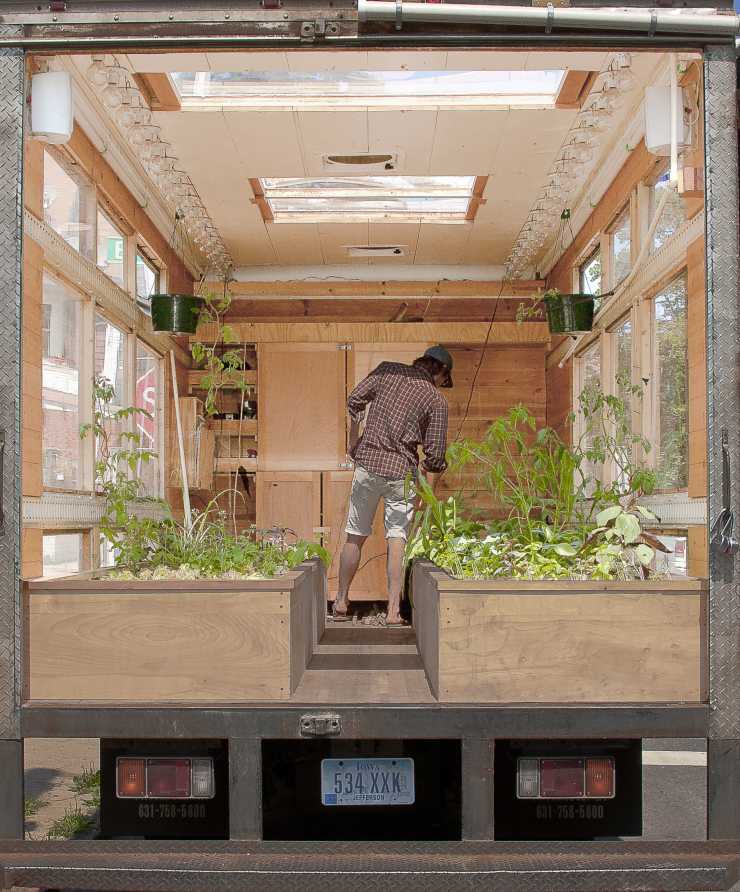 Innanför väggarna, som försetts med stora fönster i plexiglas, frodas kryddväxter, örter och grönsaker i stora planteringslådor. Växterna bevattnas med regnvatten som leds ner via ett uppsamlingssystem på taket. I en hörna finns komposten, och snart kommer ett par donerade solpaneler att placeras på taket, för att driva bilens elektriska utrustning, såsom värmelamporna som slås på vid behov.