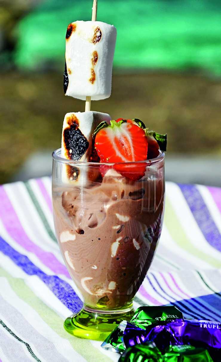 Chokladig mjukglass med jordgubbar och grillad marshmallows