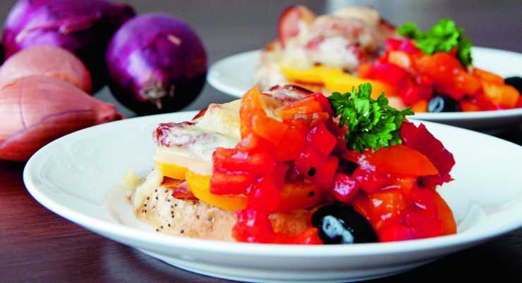 Gratinerad varm macka med skinka och paprikasalsa