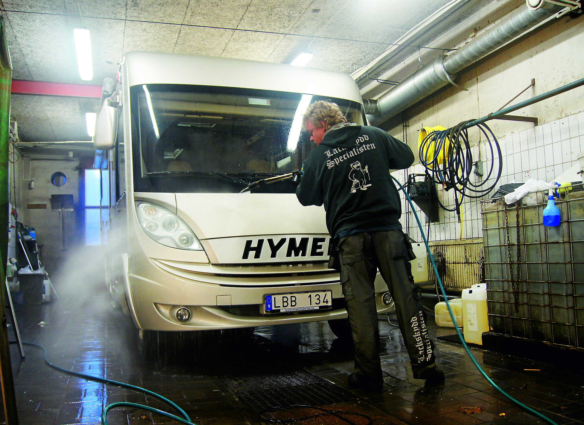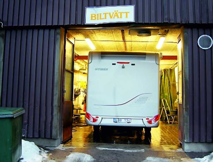Redaktionens hyrda reportagebil, en Hymer, B-Klasse 678, har varit på långresa i Europa. Nu är den rejält smutsig. Vi åker till Lackskydd-Specialisten i Södertälje. Där finns en tvätthall med en tre meter hög port.