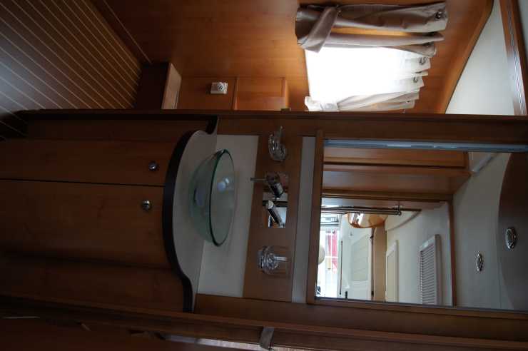 Sovadelningen delas av med två skjutdörrar och en fast mittvägg med ett handfat på sidan mot bodelen.
