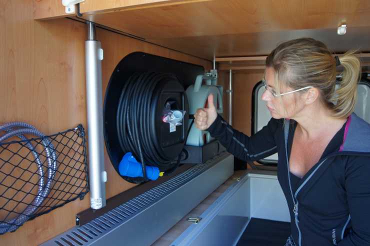 Kabel- och vattenslangvinda i lastutrymmet underlättar campingvardagen.