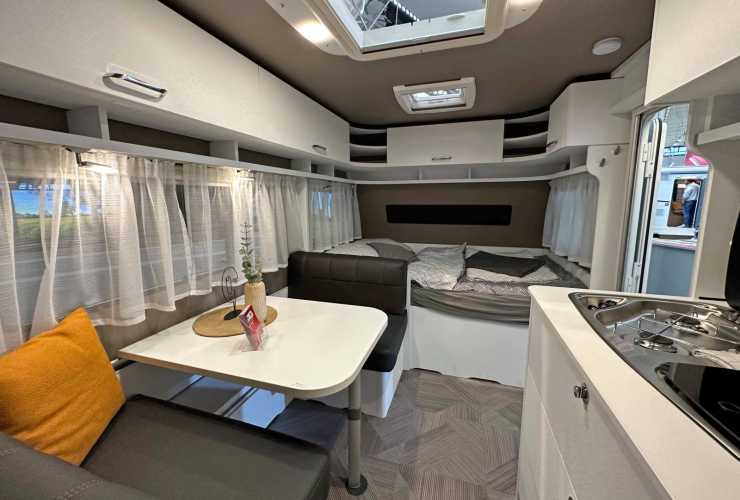 c’go 495 QSK är en kompakt vagn med allt man behöver: föräldrabädd, upp till tre platser i våningssängen, bäddbar dinette och kök med trelågig spis och rejält kylskåp. En instegsmodell som gör jobbet, men inte bjuder på några lyxiga finesser – förutom luckan då.