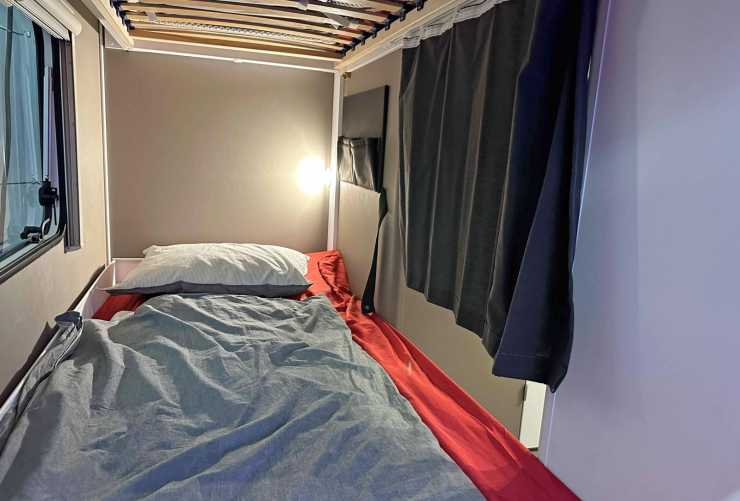 Supermysigt var det i alla fall att gå in den vägen och hamna i en vrå med eget fönster, förvaringsfickor på väggen och en gardin som kan dras för till resten av vagnen. Enda problemet lär vara alla bråk som uppstår för att alla barn – och vuxna? – kommer att vilja paxa just den bädden.