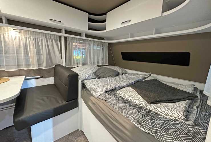Egentligen är väl öppningen vid våningssängen främst tänkt att fungera som lastlucka. Det går nämligen att få våningssängen utformad på olika sätt: med lekvrå/lastutrymme underst eller med flera bäddar som i exemplaret jag tittade in i på CMT 2024.