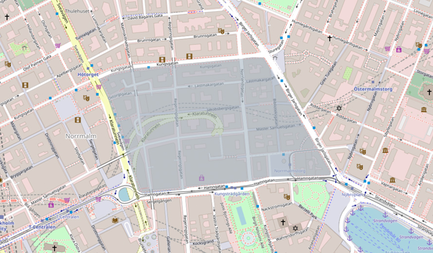 Den planerade miljözonen ramas in av Hamngatan i söder, Sveavägen i väster, Kungsgatan i norr och Birger Jarlsgatan i öster. Karta: Openstreetmap