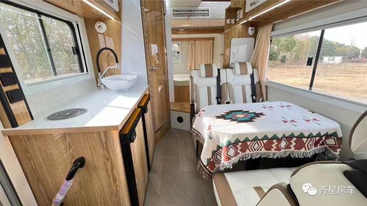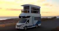 Nu har en sådan vision blivit verklighet – i Kina. Bolaget Qixing Group presenterar ett alternativ för alla som vill ha mer utsikt från husbilen. När övervåningen är nedfälld ser ekipaget ut som en vanlig husbil, men så fort du stannar kan den få balkong och ett extrarum – en trappa upp. Om det är på mekanisk väg eller genom ett knapptryck är oklart.