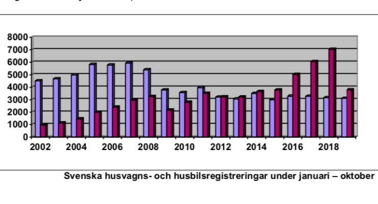 Oktober månads husbilsregistreringar visar 309 stycken, medan det i oktober föregående år registrerades 165 husbilar. Hittills under kalenderåret 2019 har det totalt registrerats 3 799 husbilar, medan det under motsvarande period 2018 registrerades 7 036 stycken. I procent innebär detta en minskning med 46,01 procent för år 2019.