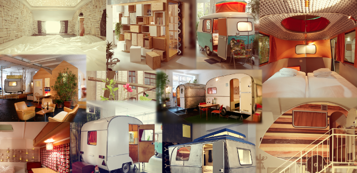 Hotellet är byggt i en gammal fabrikshall och genom att de ställt upp de tre vagnarna inomhus blir "campingen" perfekt även om det skulle vara regn och rusk utomhus. Utöver att du kan "campa" i någon av veteranhusvagnarna finns vanliga hotellrum för de mer traditionsbundna.