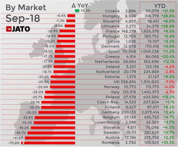Kroatien var enda land i Europa där försäljningen av nya bilar ökade. I Rumänien minskade nyregistreringarna med 73,8 procent. Sverige backade med 39,7 procent.