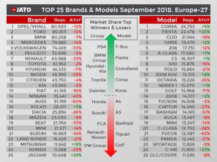 För första gången på åtta år blev inte Volkswagengruppen störst i registreringarna, den positionen övertogs av PSA. Opel Corsa körde om Volkswagen Golf och blev vanligaste nybil i september månad.