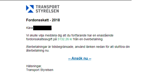 Det falska mejlet inleds med "Fordonsskatt överbetalning" och framstår som att det kommer från Transportstyrelsen. Målet är att lura av mottagaren kreditkortsuppgifter eller annan information.