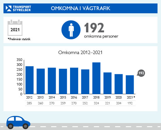 Olyckorna fortsätter att minska och för första gången någonsin är antalet omkomna färre än 200, under 2021 omkom 192 personer vilket är 12 färre än 2020 då 204 människor omkom. Det visar Transportstyrelsens preliminära statistik, den slutliga statistiken fastställs i april av myndigheten Trafikanalys och bygger på polisrapporterade olyckor som rapporterats till Strada.